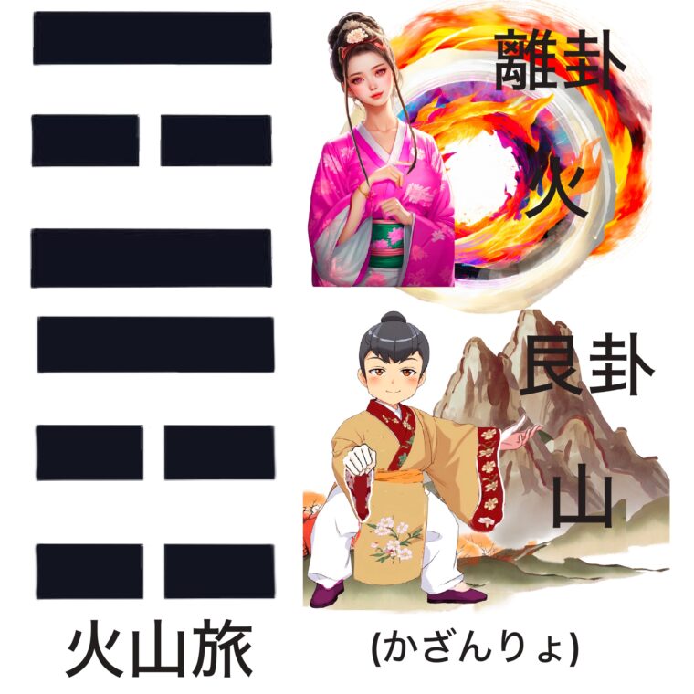 記事 【易経】火山旅(かざんりょ)六四卦 易経 周易で観る八人家族の関係性 六四卦、五六番 trivia-labo 2025年9月30日 六四卦の五六番目に位置するのが、火山旅(かざんりょ)。艮卦☶(ごんけ)の上に、離卦里(りけ)が乗っかっている形になります スポンサーリンク スポンサーリンク